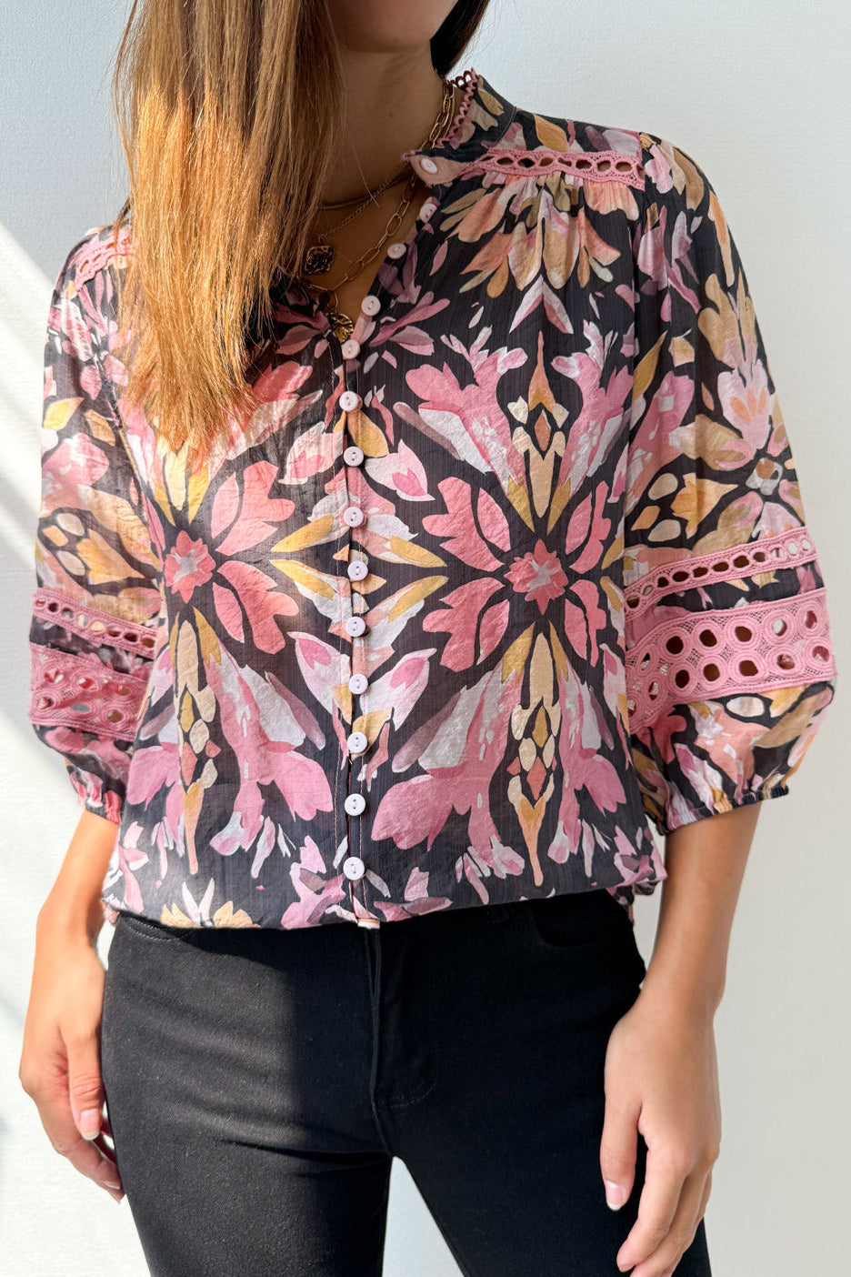 This eye-catching blouse features a bold abstract floral print in pink, yellow and black hues for a vibrant, modern look. The lightweight, breathable fabric keeps you comfortable all day, while the delicate lace trim on the neckline and cuffs adds a romantic, feminine touch. The button-front design and billowy 3/4 sleeves offer a relaxed, flattering fit that pairs effortlessly with jeans or tailored pants, making it perfect for both casual outings and dressed-up occasions.